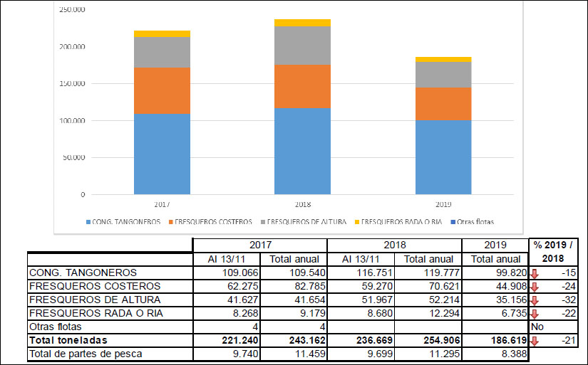 Hasta mediados de noviembre se desembarcaron 186.619 toneladas, con una merma del 21,1 por ciento respecto a igual período del año pasado. En este marco, la flota fresquera de altura fue la que más volumen perdió, aproximadamente un 32 por ciento.