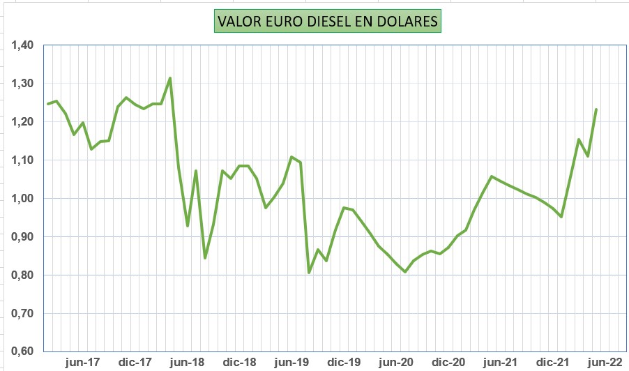 En el mismo se aprecia una inflexión al alza y cambio de tendencia a partir del junio del año 2020, donde los precios en el surtidor comienzan a ajustarse mucho más rápido que el precio del dólar exportación, pasando de 80 centavos de dólar el litro de GAS OÍL EURO DIESEL al actual de 1.26 dólar; con lo que el impacto en dólares directo es del 56.25% en dólares en los últimos 2 años. Cifra nada despreciable que impacta con la rentabilidad de las empresas que de a poco, comienzan a hacerse negativas, y mientras tanto, nadie dice nada…
