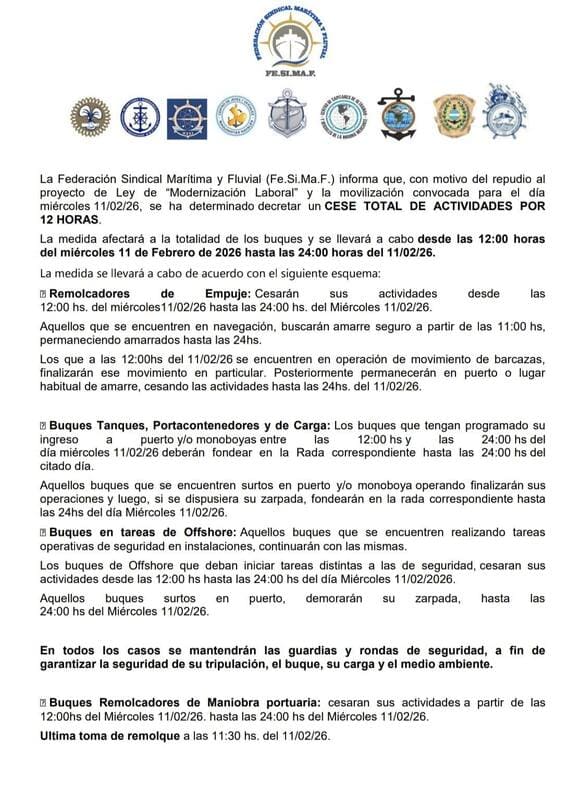En ese contexto, la Federación resolvió decretar un cese total de actividades por el plazo de 12 horas, que se extenderá desde las 12:00 hasta las 24:00 del 11 de febrero de 2026. La medida alcanzará a la totalidad de los buques y servicios marítimos, con guardias mínimas destinadas exclusivamente a garantizar condiciones de seguridad.