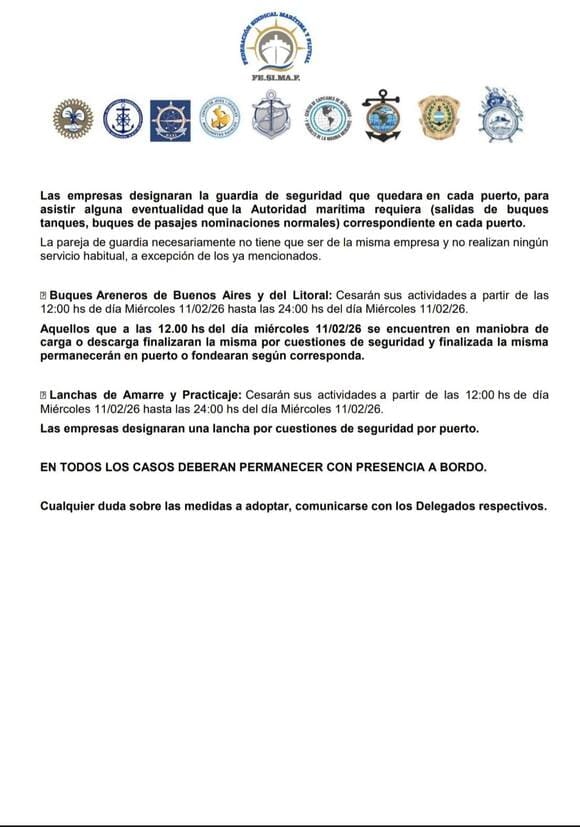 De acuerdo con lo informado, durante el período de cese se mantendrán únicamente las guardias y rondas de seguridad necesarias para resguardar a las tripulaciones, los buques, las cargas y el medio ambiente. Las autoridades gremiales indicaron que cualquier situación excepcional deberá ser canalizada a través de los delegados correspondientes en cada jurisdicción.