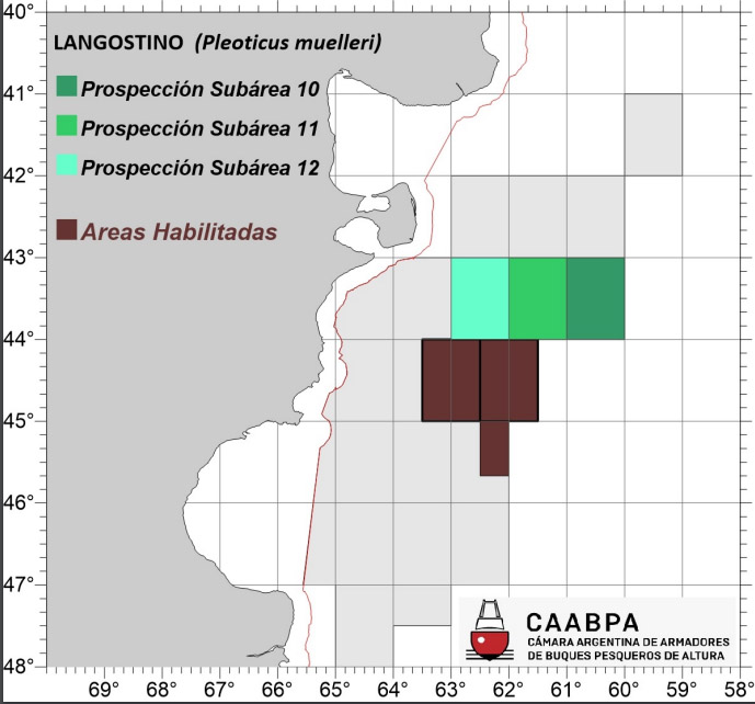 El Consejo Federal Pesquero autorizó la realización de una nueva prospección de langostino en aguas nacionales. Se realizará desde el lunes y hacia el norte, en el área localizada entre los paralelos 43° y 44° de latitud Sur, y los meridianos 63° y 60° de longitud Oeste.