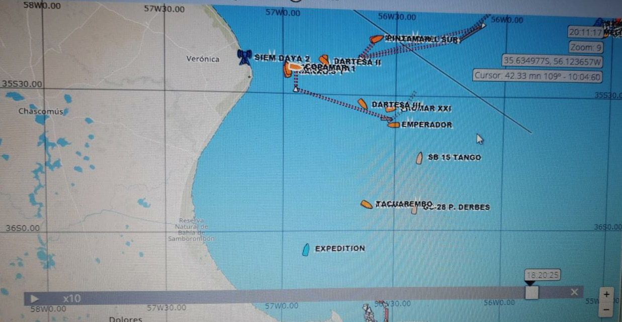 Son al menos catorce barcos del país vecino que están posicionados en el área, según la imagen que devuelve el control satelital. Sábado, domingo y lunes estuvieron trabajando ahí, exponen en el sector.
