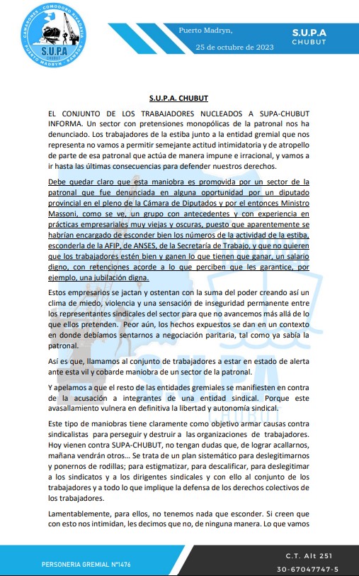 “Hace pocos días, el compendio general de industrias pesqueras langostineras radicó la denuncia en los tribunales penales de la ciudad de Rawson, en la provincia de Chubut, sobre tres dirigentes sindicales que habrían exigido el pago de coimas, seguido de intimidaciones personales y laborales que impiden el normal desarrollo de la pesca en los principales puertos del país”.