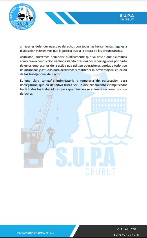 El envío de prensa recibido por PESCARE indica que “por estas horas, la justicia trabaja contra reloj en una causa que tiene como protagonistas a varios dirigentes del Sindicato Unidos Portuarios Argentinos (SUPA), denunciados por ejercer acciones extorsivas y amenazas, que impiden el inicio de la zafra pesquera en el sur del país”.