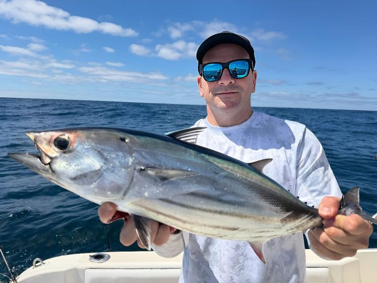 Con su embarcación deportiva, Martín, prima facie pensando que era un cardumen de bonito, dio con una concentración con las mismas características pero ante la sorpresa de la presencia de atún barrilete, como se dice en la jerga atado al cocoliche de viejos e históricos pescadores italianos con una expresión de sobresalto: » u sciamme e pisce..!»; una vez detenido en medio de ese vergel, avisó vía VHF a las primeras lanchas que, no demoraron en llegar, cuando días atrás, concretaron descargas celebradas casi como una pequeña fiesta laboral. La alegría no se explica solo por el valor comercial: el atún barrilete es voraz, extremadamente veloz, “pez con mucha sangre y genio”, batallador; exige técnica, temple y lectura del mar. Y las tallas que se vienen observando —en torno a los 3 a 5 kilos— le agregan al relato un condimento deportivo que seduce a cualquiera que entienda de aparejos, líneas y manos firmes a la hora de pescar.