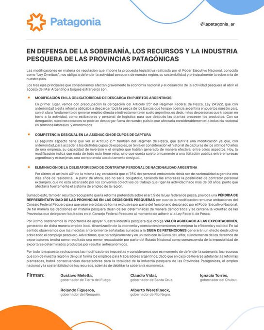 El rechazo de los gobernadores de las provincias de la Patagonia se dio a través de un comunicado en conjunto donde los mandatarios de Chubut, Ignacio Torres; de Río Negro, Alberto Weretilneck; de Santa Cruz, Claudio Vidal; de Tierra del Fuego, Gustavo Melella; y de Neuquén, Rolando Figueroa, quienes expresaron que la mayor preocupación gira en torno a la modificatoria en la obligatoriedad de descarga en los puertos argentinos; la competencia desigual en los cupos de captura y la eliminación de la obligatoriedad de contratar personal de nacionalidad argentina.