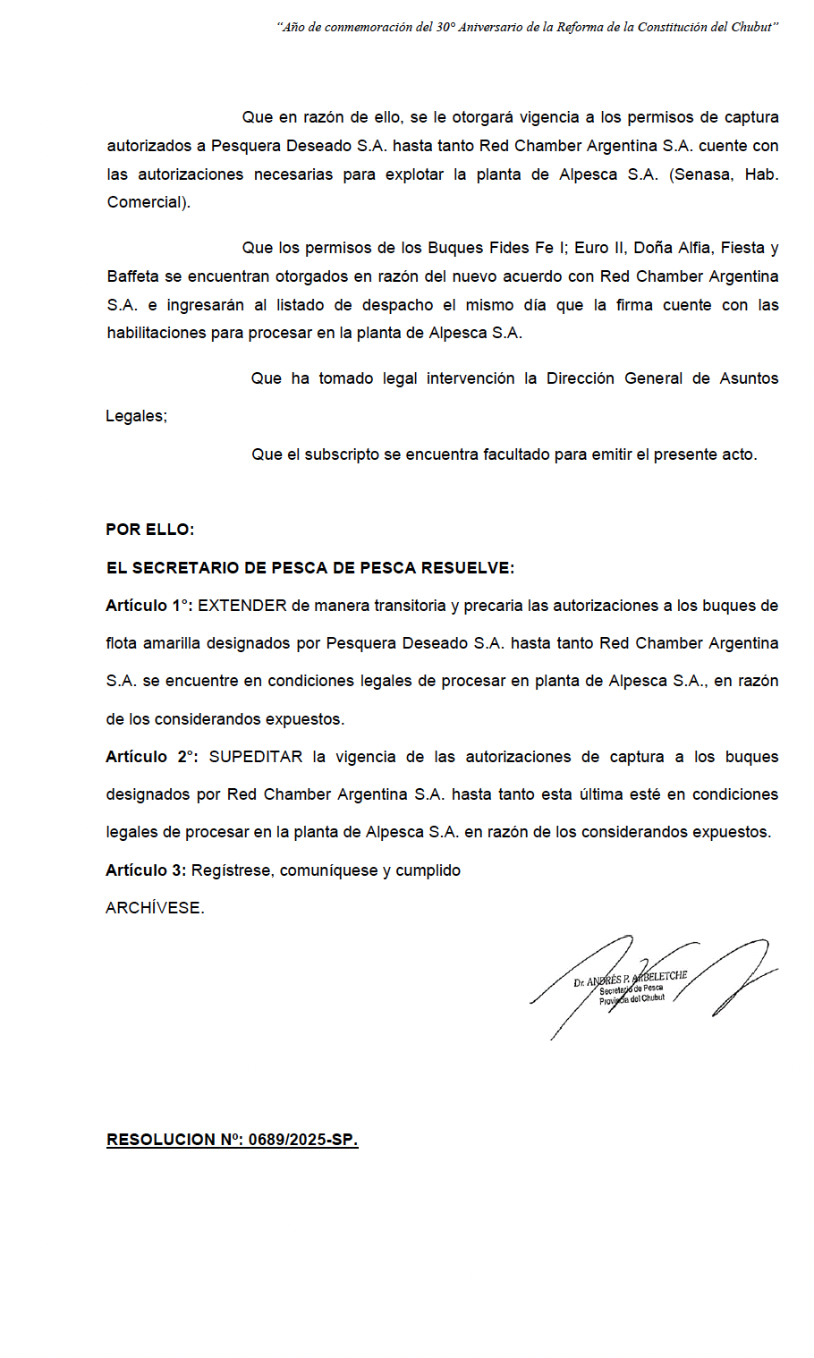 Con el objetivo de preservar la continuidad productiva y evitar un impacto negativo sobre la cadena laboral, se resolvió que Pesquera Deseado S.A. continúe operando la planta de la ex Alpesca de manera excepcional y transitoria, hasta tanto Red Chamber Argentina S.A. se encuentre en condiciones legales y operativas de asumir plenamente la explotación industrial.
