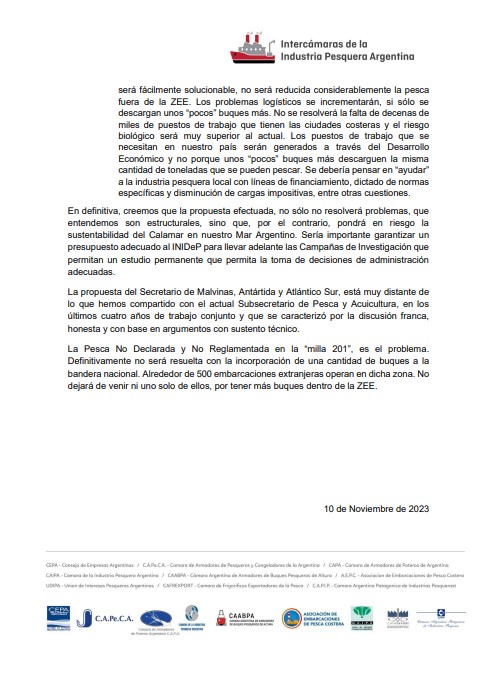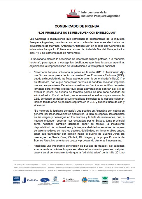 “Las Cámaras e Instituciones que componen la Intercámaras de la Industria Pesquera Argentina, manifiestan su rechazo a las declaraciones efectuadas por el Secretario de Malvinas, Antártida y Atlántico Sur, en el seno del ‘Congreso de la Iniciativa Pampa Azul’, llevado a cabo en la ciudad de Mar del Plata, entre los días 7 y 8 del corriente mes de Noviembre.