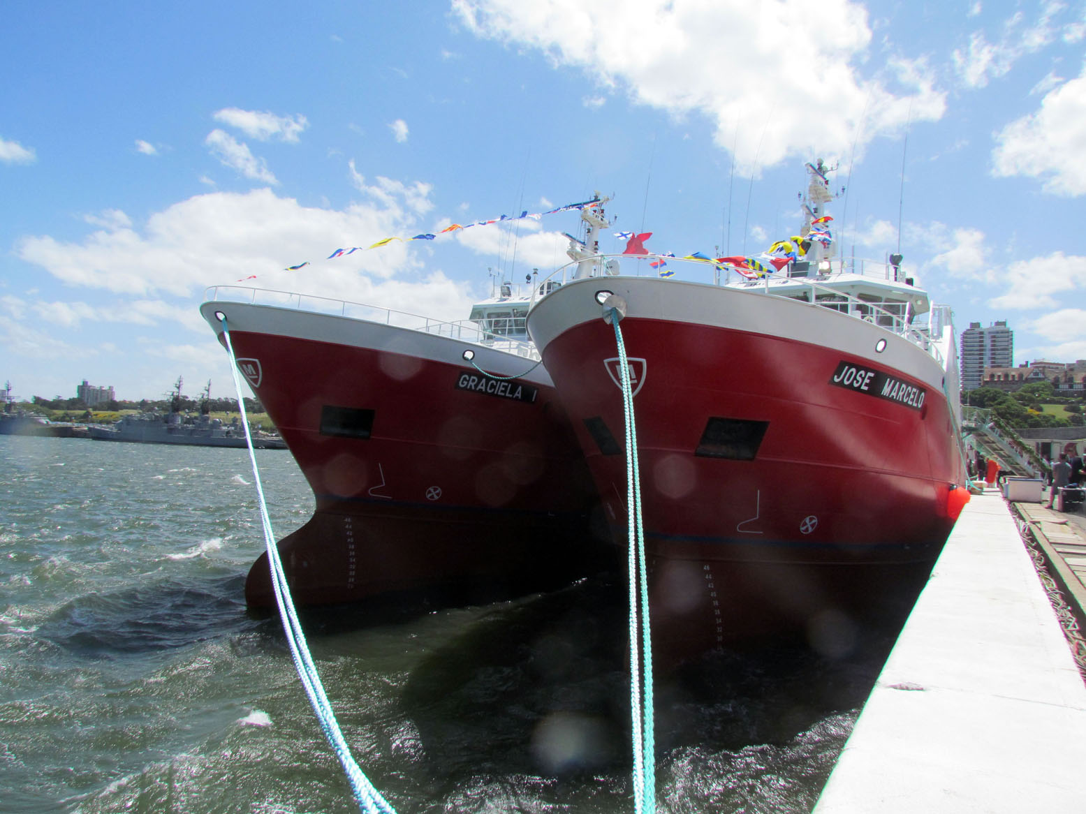 El “José Marcelo” y el “Graciela I”, los dos flamantes barcos del Grupo Moscuzza fueron presentados oficialmente en la tarde de este sábado. El acto se desarrolló en la Base Naval, en el sector de Escollera Norte donde se encuentran amarradas ambas unidades.