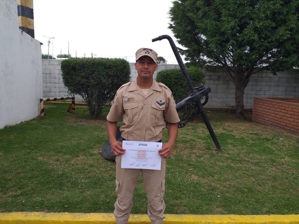 Una vez finalizado el acto, PESCARE dialogó con quien obtuvo la mejor calificación, el Cabo Primero de la Prefectura Rawson (Chubut) Gabriel Huenchun.