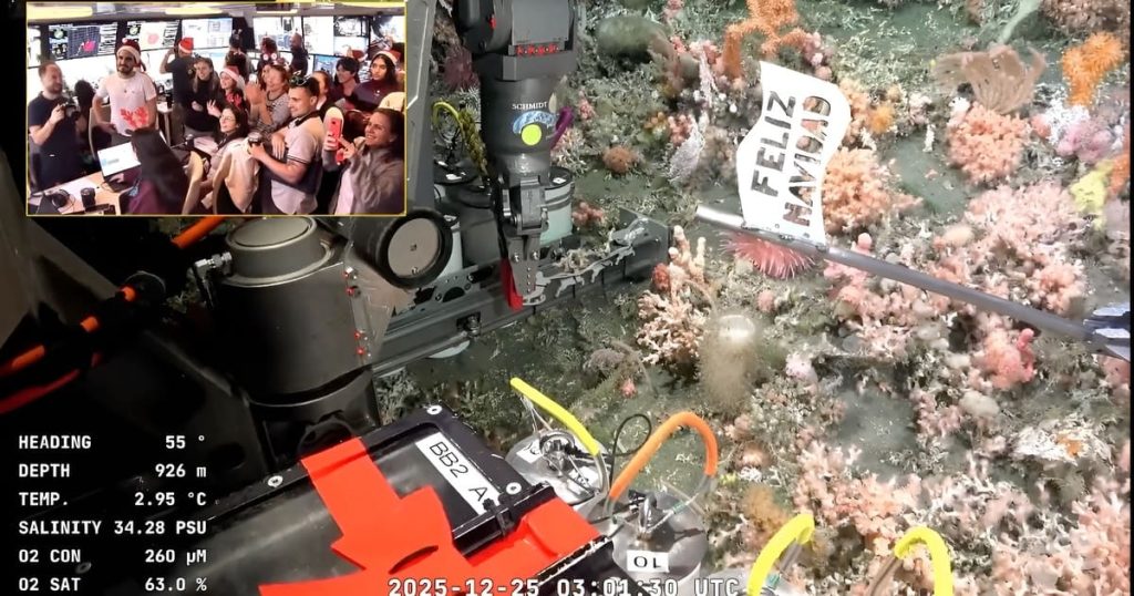 La escena ocurri贸 con la precisi贸n de una maniobra cient铆fica y la potencia simb贸lica de un ritual compartido. En plena inmersi贸n, el ROV SuBastian鈥攙eh铆culo operado remotamente鈥攗tiliz贸 su brazo rob贸tico para colocar una bandera con el mensaje 鈥淔eliz Navidad鈥 sobre el fondo marino, a 926 metros bajo la superficie. La transmisi贸n en vivo amplific贸 el gesto, el p煤blico asisti贸, en tiempo real, a una imagen inhabitable para el ojo humano sin mediaci贸n tecnol贸gica.