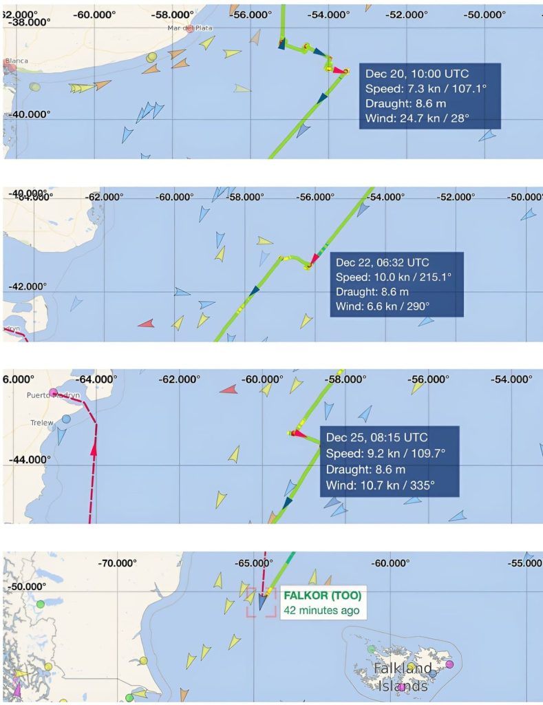 L铆nea de tiempo de las campa帽as del Falkor Too en el Mar Argentino (2025鈥揺nero 2026)
