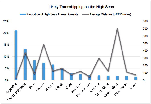 Puesto en escala global, la ZEE Argentina se ubica en el segundo puesto en importancia para la problemática que se registra en altamar, donde se cree se realizaron un total de 5.065 transbordos durante el perÃodo considerado.  En total, unos 965 buques pesqueros y 282 cargueros estuvieron involucrados.
