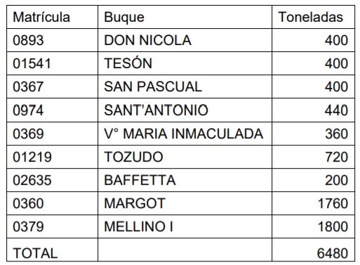 De la reserva de administración de merluza común al 31 de agosto del corriente con un stock de 8.657 toneladas de las cuales, teniendo en cuenta la prioridad establecida en la Resolución CFP N° 10/2021 (inciso d) para el abastecimiento de materia prima a las plantas de procesamiento en tierra, se decide por unanimidad asignar de la Reservade Administración de la especie, para el período anual 2021, un volumen de capturade merluza común a los buques fresqueros, de la provincia de Buenos Aires, peticionantes y en las cantidades que surgen de la nómina que se detalla: