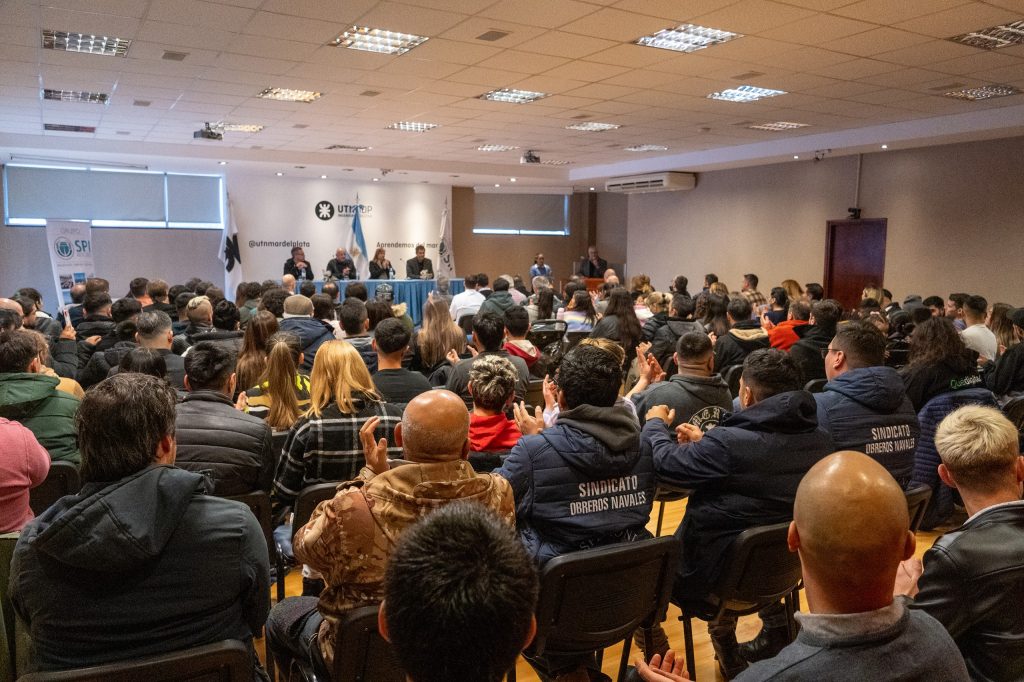 El acto de entrega se realizó esta tarde en el aula magna de la Facultad Regional Mar del Plata de la Universidad Tecnológica Nacional (UTN) y contó con la presencia no solo de los trabajadores y trabajadoras, sino también de sus familiares más cercanos. Además del equipo de la sede local de SPI, también viajaron para este encuentro trabajadores de la sede de Campana del astillero.