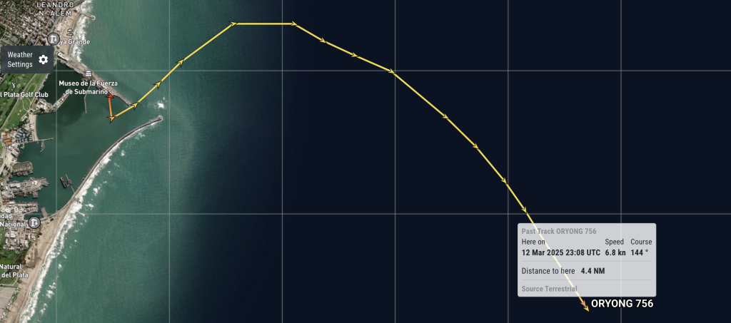 El capitán del potero, informó que a las 20:08 horas del día miércoles 19 de marzo 2025, la embarcación inició navegación con destino a Puerto Deseado, con una estimación de arribo hoy a las 05:00 horas. Asimismo, se confirmó que el BP Oryong 756 reanudó su navegación a las 20:07 horas con destino a Mar del Plata, previendo su llegada hoy. Cabe destacar que desde su partida del puerto local, amarrado en la escollera norte y a tan solo 6 millas de la boca del puerto local, esta embarcación permaneció con el AIS apagado, por cuanto de muy difícil identificación electrónica para otros buques, pudiendo constituir un agravante para la navegación y el evento en particular; puesto que la Autoridad Marítima exige el AIS en modo encendido siempre que esté en navegación.