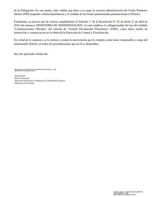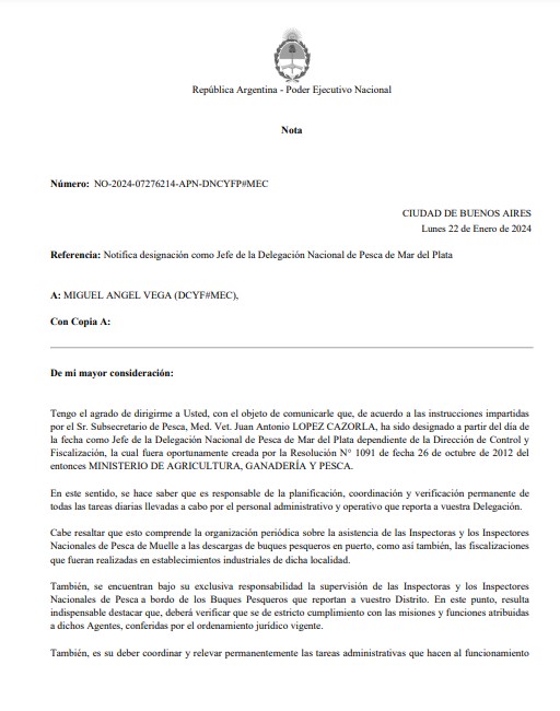 Ayer, en horas de la mañana, el mismo envió una nota oficial para nombrar al nuevo Jefe de Distrito Pesca en Mar del Plata.