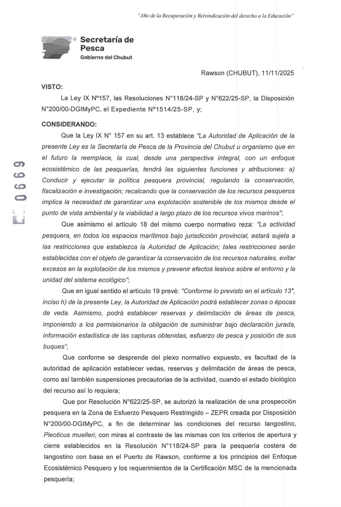 La operación, que se extenderá hasta el viernes, fue autorizada por la Secretaría de Pesca de la provincia mediante la Resolución SPCh Nro.669/2025 con la firma de su titular, el Dr. Andrés Arbeletche.
