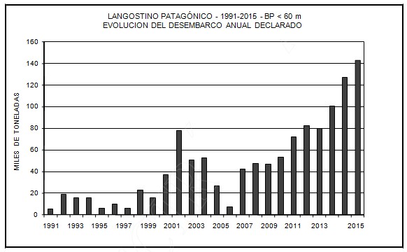 “Otro nuevo récord en la historia de esta pesquería lo constituyó el desembarco declarado de langostino capturado por la flota fresquera con asiento en el puerto de Rawson (BP con eslora menos a 21 metros de eslora) en la temporada 2015, que superó las 38.400 toneladas, un valor 16% mayor al desembarco de la misma flota en 2014”, subraya el informe.