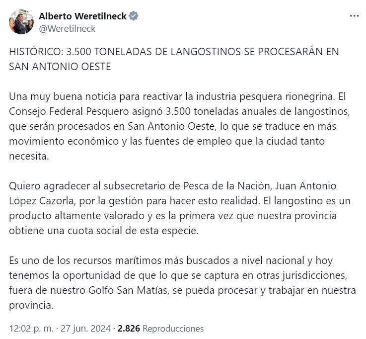 Por su parte, con manifiesto beneplácito, el Sr. gobernador de Río Negro, Alberto Weretilneck, en su cuenta X posteaba con algarabía tamaña asignación titulándola como «Histórica«.