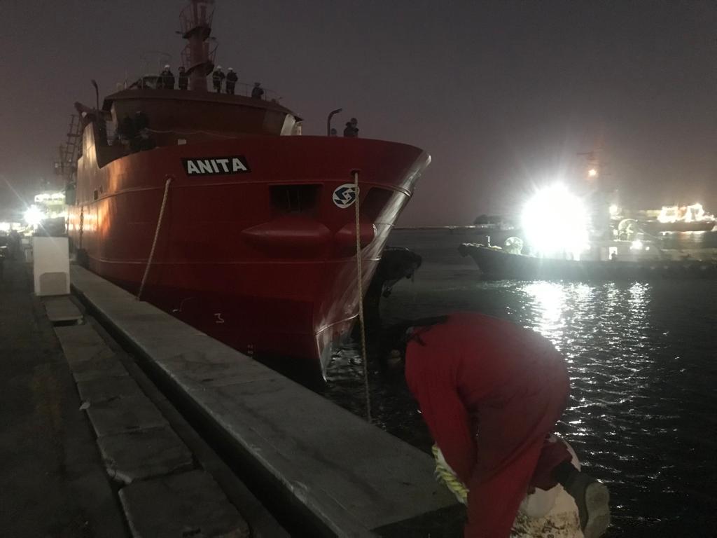 El BP Anita tiene previsto dejar este espejo de agua al momento de máxima pleamar de hoy, cerca de las 18:30hs con una super marea que le permitirá atracar -remolcadores mediantes- al muelle del INIDEP para las 20:30hs aproximadamente.