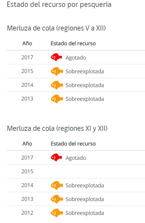 En cuanto a la merluza de cola, desde el 2017, segun informes oficiales de la Subsecretaria de Pesca del país trasandino, el recurso se encuentra AGOTADO (e laño pasado solo se registraron 5497Tn descargadas) y como tal sobreexplotado desde 2012 a ese año. Cabe destacar que durante años, la merluza de cola fue utilizada para elaboración de harina y lamentablemente la flota harinera -ya casi desaparecida por falta de recurso pelágico y una pésima administración- terminó agotando ese recurso, que involucra tambien reducciones considerables por encima del 85% de tallas adultas en el mar argentino. Una editorial ámplia de investigadores del INIDEP en modelos de desarrollos evolutivos de la especie sostienen que es precisamente en el Océano Pacífico donde los adultos desovan y reproducen, mientras pasan hacia el Atlántico por los canales fueguios y al sur del Cabo de Hornos, ya en mar abierto.
