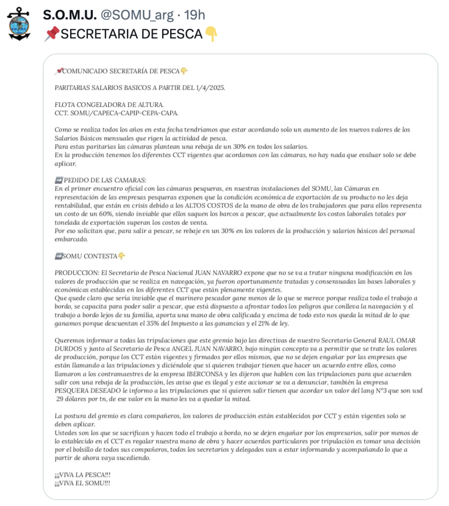 Además, Navarro enfatizó que «los marineros realizan un trabajo calificado y riesgoso, afrontando largos periodos de navegación lejos de sus familias y que, a pesar de ello, ya sufren importantes descuentos por el impuesto a las ganancias y otros tributos «. En este sentido, el SOMU denunció que algunas empresas, como Iberconsa y Pesquera Deseado, estarían intentando negociar directamente con las tripulaciones por fuera del gremio para que acepten reducciones en la producción, lo que el gremio considera ilegal y asegura que denunciará ante las autoridades correspondientes.