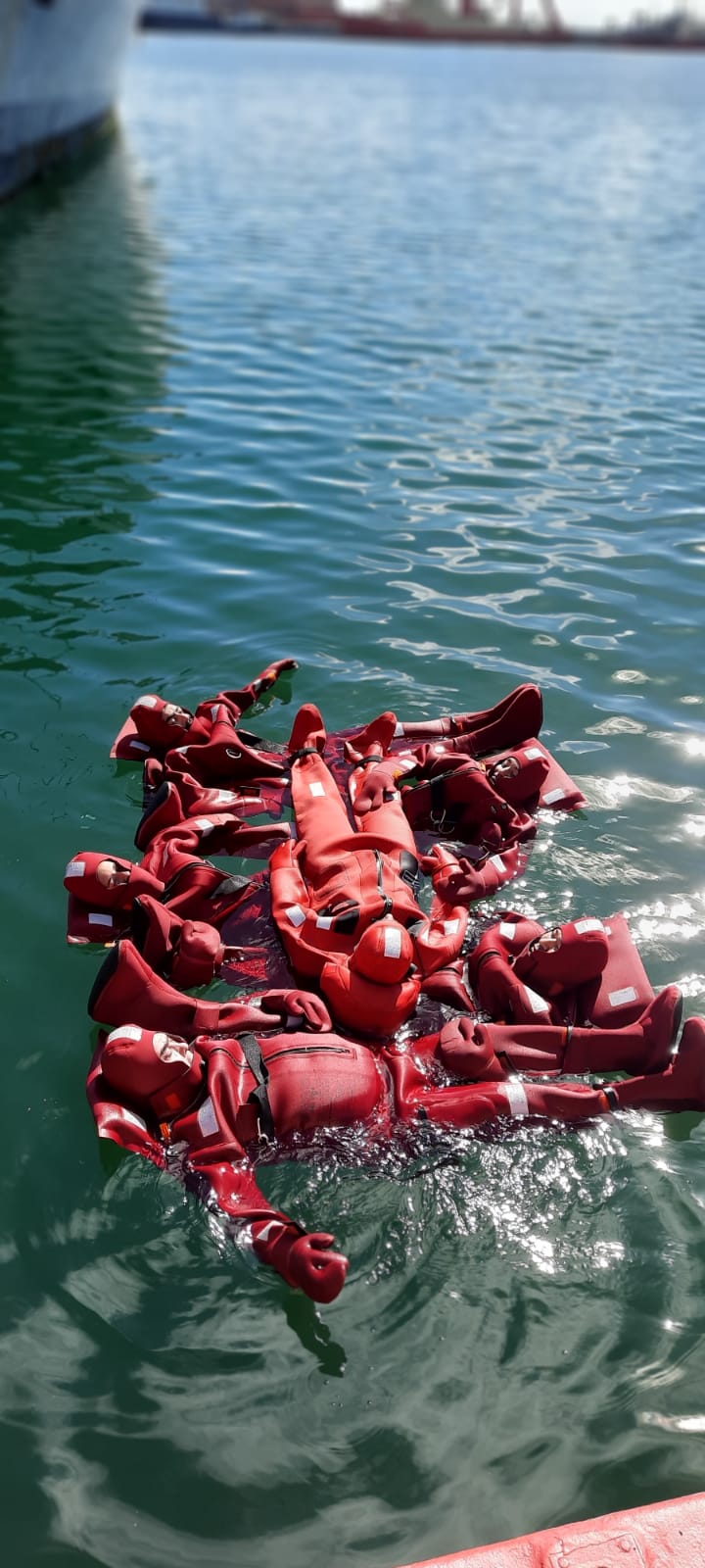 A través de esta modalidad, se llevaron a cabo distintos ejercicios de supervivencia en el mar, con los adecuados trajes de inmersión para agua fría. Además se realizaron diversos tipos de saltos y desplazamientos con balsas salvavidas, además de adentrarse y “repasar” los distintos elementos que poseen cada una de las balsas, que si bien el personal posee el conocimiento necesario para su utilización, bien valen las actualizaciones.