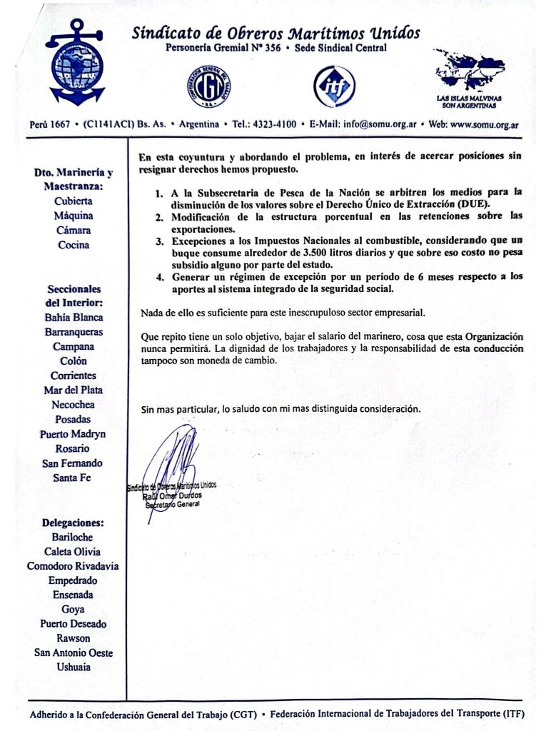 鈥El SOMU no consentir谩 bajo ning煤n concepto una rebaja salarial. La dignidad de los trabajadores y la responsabilidad de esta conducci贸n no son monedas de cambio鈥, concluy贸 el secretario general. Con este planteo, el sindicato busca que el Poder Ejecutivo nacional revierta las decisiones que, a su entender, agudizan una crisis que golpea con fuerza a los trabajadores del mar y a las econom铆as regionales que dependen de ellos.