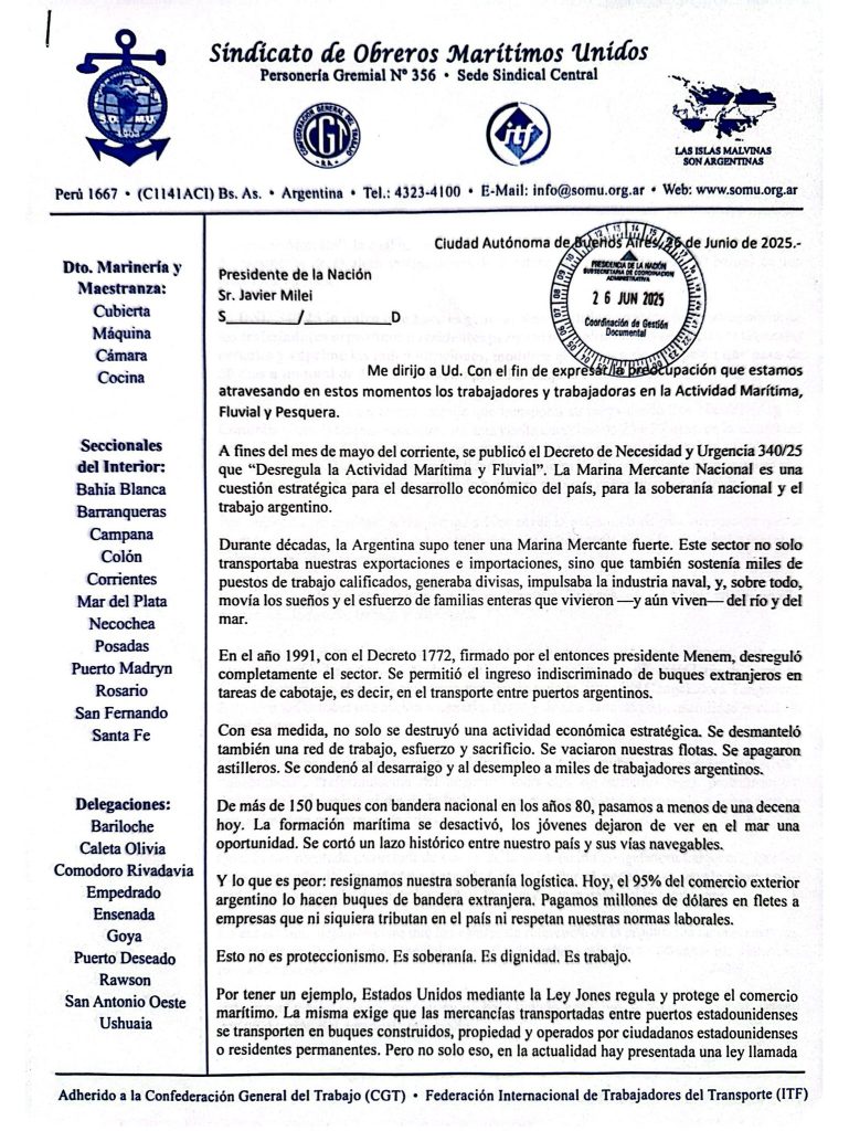 El Sindicato de Obreros Mar铆timos Unidos (SOMU), encabezado por su secretario general Ra煤l Durdos, elev贸 un petitorio al presidente de la Naci贸n, Javier Milei, para manifestar la profunda preocupaci贸n del gremio frente a la situaci贸n que atraviesan los trabajadores de la marina mercante, el sector fluvial y, especialmente, la pesca. El reclamo se centra en la derogaci贸n del DNU 340/2025, que habilita el ingreso de buques de bandera extranjera al cabotaje nacional, una medida que, seg煤n el gremio, amenaza con destruir miles de puestos de trabajo y debilitar la soberan铆a log铆stica del pa铆s.
