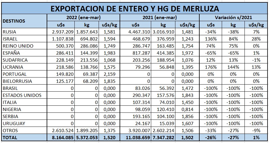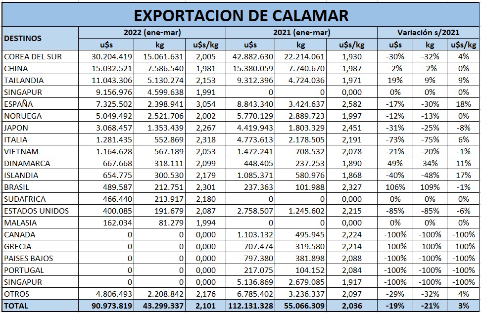 En grandes rasgos, las principales especies comercializadas, Merluza, Langostino y Calamar, vieron disminuidos sus volúmenes de exportaciones, en cantidades.