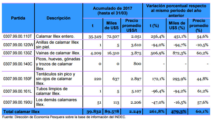 Entre enero y marzo, los envíos de pescados y mariscos alcanzaron las 118.947 toneladas por 445,5 millones de dólares. La diferencia entre períodos estuvo marcada por el repunte del calamar, que creció un 261,8 por ciento en volumen y 479,3 en valor.