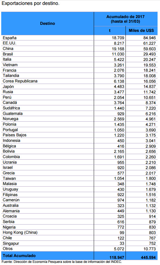 En cuanto a destinos, España, Estados Unidos, China, Brasil e Italia lideran el cuadro