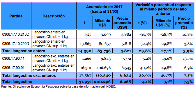 En tanto, el langostino mantiene cierta estabilidad y con precios en alza cuando aún resta verse el impacto que tendrá la temporada en aguas nacionales. Durante los primeros tres meses del año, se comercializaron 31.957 toneladas por 200,2 millones de dólares.