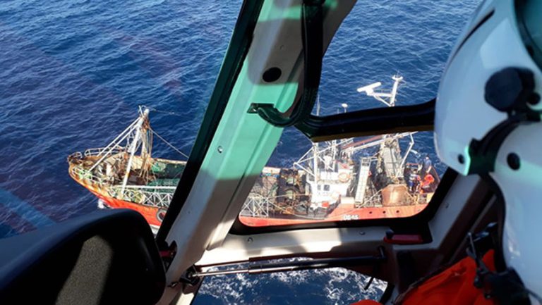 Arribados al lugar, la aeronave se posicionó sobre el pesquero, permitiendo que dos nadadores de rescate descendieran a la embarcación, colocaran al enfermo en una camilla y lo izaran lentamente.