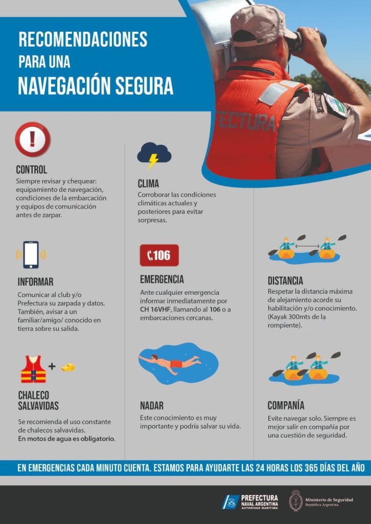 «Estas recomendaciones permiten una ejecución segura de las diferentes actividades deportivas, sin reemplazar la obligatoriedad de cumplir con todas las normativas vigentes», señalaron desde Prefectura, subrayando la relevancia de actuar con prudencia y responsabilidad.
