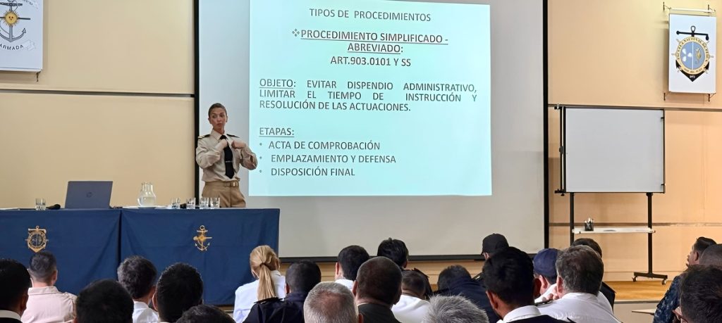 Durante su exposición, Maciel explicó los procedimientos que lleva adelante la Autoridad Marítima en el marco de los sumarios administrativos que se tramitan conforme al Régimen de la Navegación Marítima, Fluvial y Lacustre (REGINAVE). La funcionaria detalló los principios que rigen estos procesos, las etapas esenciales del trámite y la competencia de la Prefectura Naval Argentina en el ejercicio de su jurisdicción Administrativo-Policial.