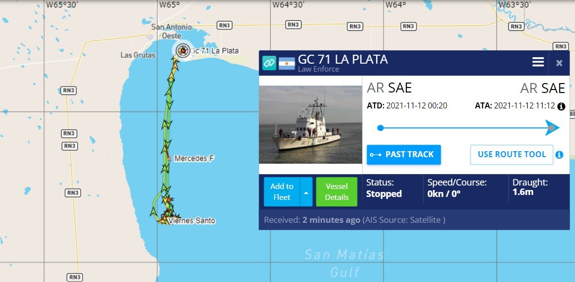 A través del derrotero del BP Marina Z, donde permaneció en la zona de búsqueda de la ultima posición conocida del buque pesquero siniestrado, se pudo observar una rápida movilización a toda maquina hacia el puerto de San Antonio, infiriendo alguna novedad desde la zona de búsqueda. Mas tarde, sobre las 12:50hs de hoy, extraoficialmente, personal del gremio que nuclea los tripulantes en la localidad portuaria rionegrina , confirmaron que se habría dado con la localización de un tripulante, lamentablemente, fallecido en el mar y trasladado a bordo de la embarcación al puerto. Se destaca sobre el lugar con hora estimada de arribo 18:30, el GC-25 Azopardo que zarpó desde Puerto Madryn apenas conocido el incidente para intentar dar con el Patrón de la embarcación que aun no fue identificada la posición justa de naufragio.