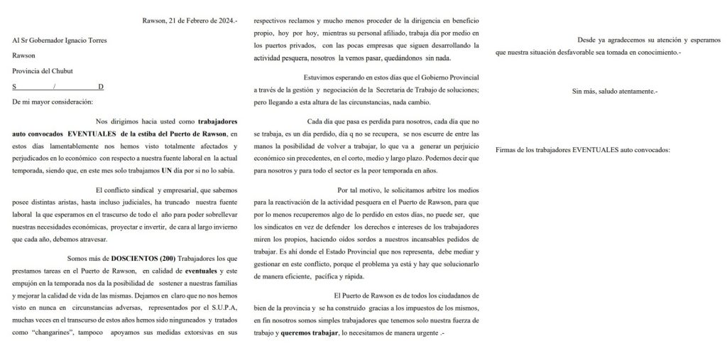 Por otra parte, los trabajadores eventuales de la estiba de Rawson, utilizaron la misma metodología para llegar a Torres, a quien le expresaron que “nos dirigimos hacia usted como trabajadores auto convocados EVENTUALES de la estiba del Puerto de Rawson, en estos días lamentablemente nos hemos visto totalmente afectados y  perjudicados en lo económico con respecto a nuestra fuente laboral en la actual temporada, siendo que, en este mes solo trabajamos UN día por si no lo sabía.”