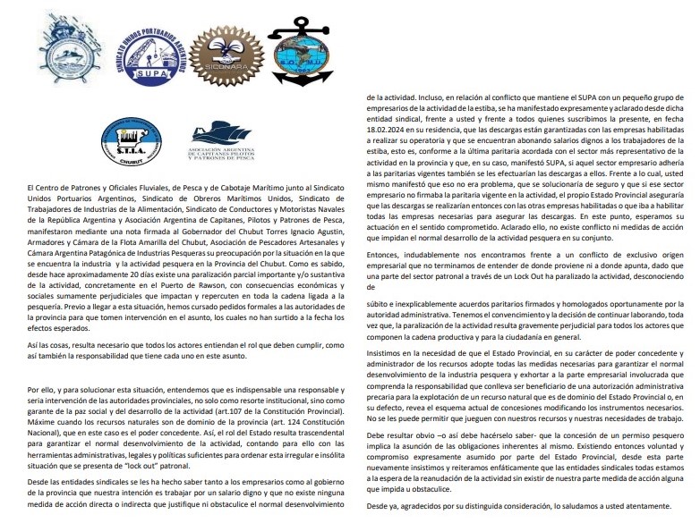 “Desde las entidades sindicales se les ha hecho saber tanto a los empresarios como al gobierno de la provincia que nuestra intención es trabajar por un salario digno y que no existe ninguna medida de acción directa o indirecta que justifique ni obstaculice el normal desenvolvimiento de la actividad. Incluso, en relación al conflicto que mantiene el SUPA con un pequeño grupo de empresarios de la actividad de la estiba, se ha manifestado expresamente y aclarado desde dicha entidad sindical, frente a usted y frente a todos quienes suscribimos la presente, en fecha 18.02.2024 en su residencia, que las descargas están garantizadas con las empresas habilitadas a realizar su operatoria y que se encuentran abonando salarios dignos a los trabajadores de la estiba, esto es, conforme a la última paritaria acordada con el sector más representativo de la actividad en la provincia y que, en su caso, manifestó SUPA, si aquel sector empresario adhería a las paritarias vigentes también se les efectuarían las descargas a ellos. Frente a lo cual, usted mismo manifestó que eso no era problema, que se solucionaría de seguro y que si ese sector empresario no firmaba la paritaria vigente en la actividad, el propio Estado Provincial aseguraría que las descargas se realizarían entonces con las otras empresas habilitadas o que iba a habilitar todas las empresas necesarias para asegurar las descargas. En este punto, esperamos su actuación en el sentido comprometido. Aclarado ello, no existe conflicto ni medidas de acción que impidan el normal desarrollo de la actividad pesquera en su conjunto.”