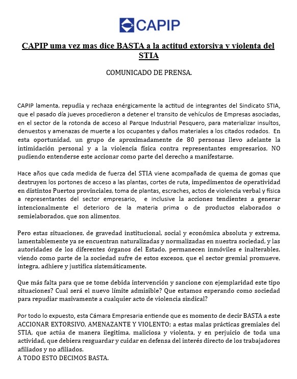 CAPIP, expresó el sentir de un sector que aprecia las discusiones salariales como mecanismo para encontrar el punto de equilibrio entre las partes representadas en la discusión respetuosa de los CCT, pero esto va por fuera de todo raciocinio. Ante lo sucedido, desde la Cámara emitieron un comunicado repudiando los conflictivos y oscuros hechos, solicitando la intervención de las autoridades provinciales para terminar con este “accionar extorsivo, amenazante y violento «, cerrando la misiva diciendo «a todo esto decimos basta «.
