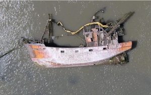 Se trata del casco hundido del BP Sagrado Corazón en el cauce final del río Chubut, obstaculizando y probablemente generando un impacto al medio ambiente, lo que determinará la justicia en próximas semanas una vez ingresada la denuncia pertinente.