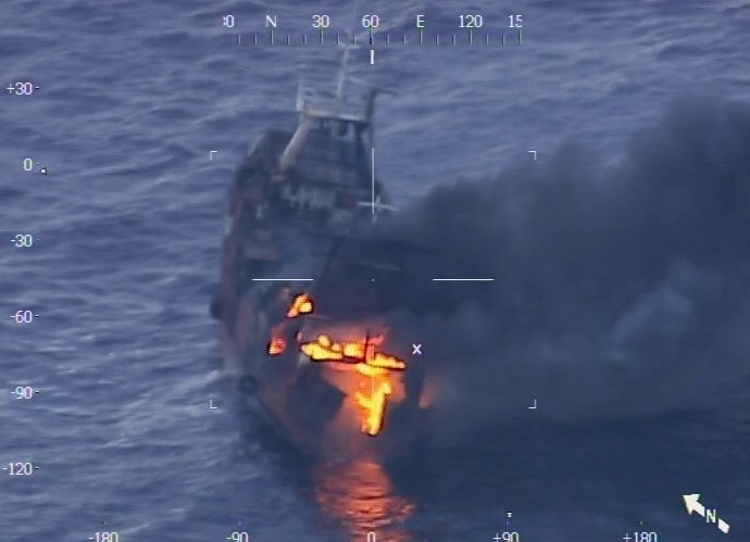 El foco se desató cuando el buque navegaba mar adentro, al sudeste Bahía Blanca. Sus 17 tripulantes fueron rescatados por el “Atrevido”. Intervienen diversos medios de Prefectura.