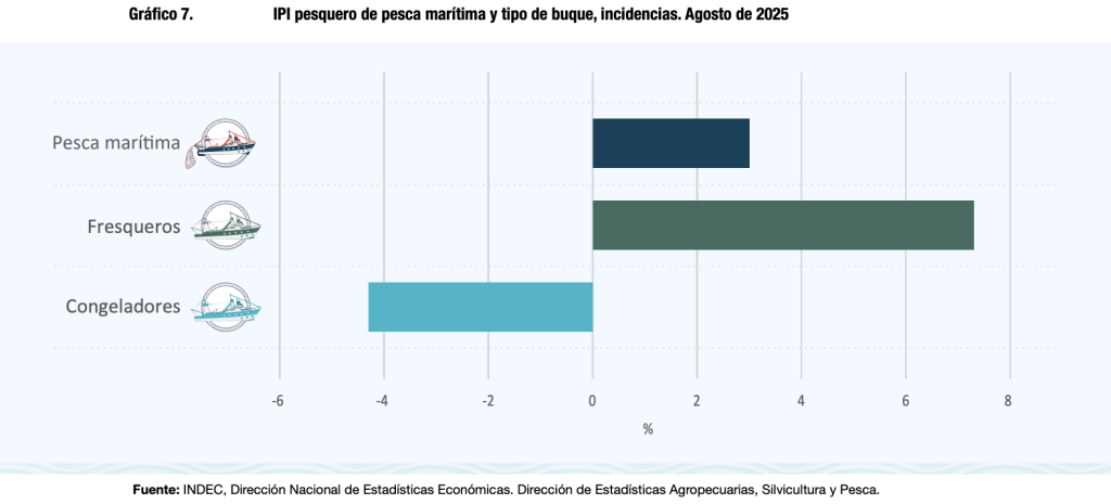 En el universo de la pesca mar铆tima, los resultados muestran matices. El sector creci贸 3% interanual en agosto, pero el balance de los primeros ocho meses marca una ca铆da del 28% respecto al a帽o anterior.
