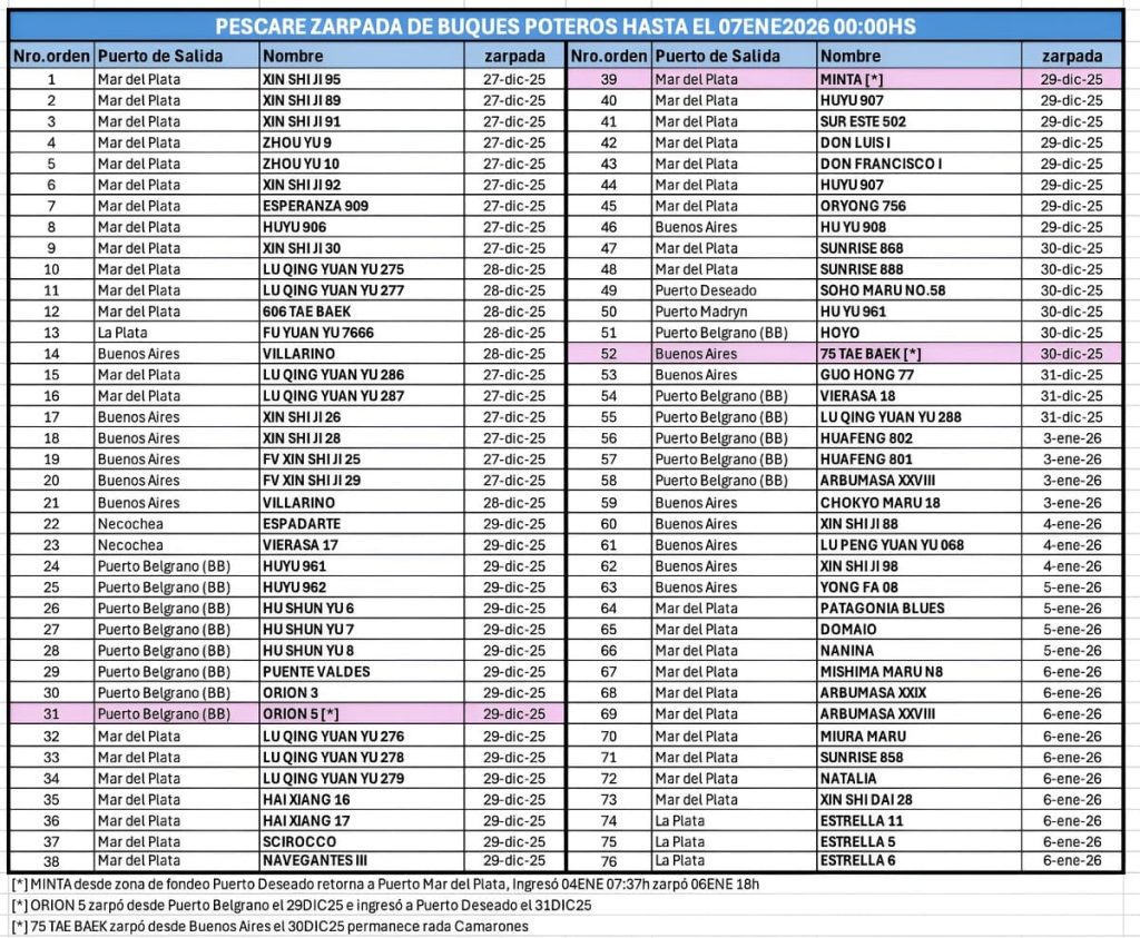 Según lo establecido en el Acta CFP Nro.33/2025, desde la hora 00:00 de hoy 7 de enero de 2026 podrán operar al sur del paralelo 44° exclusivamente aquellos buques que hayan registrado actividad pesquera al sur del paralelo 49°S durante al menos tres dÃas. En tanto, el resto de la flota quedará habilitado a partir de la hora 00:00 del 9 de enero de 2026.