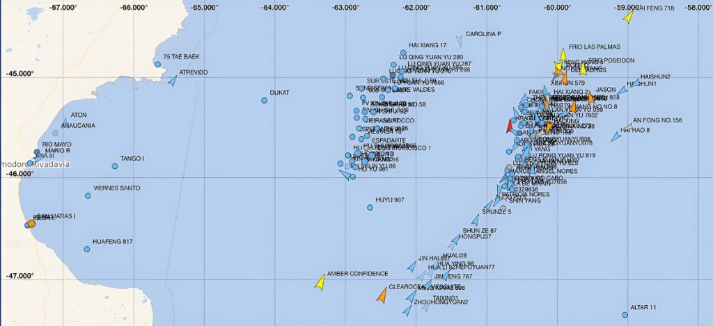 A partir de la jornada previa, el grueso de la flota dirigida al calamar efectuó un desplazamiento operativo con rumbo noreste, posicionándose en el área adyacente a la localidad de Camarones. Esta zona de operaciones se circunscribe a una franja situada a 140 millas de la lÃnea de costa, delimitada por los paralelos 44°45’S y 46°00´S. Dicha ubicación guarda una proximidad de 60 millas con la flota de banderas extranjeras que opera en el área adyacente a la Zona Económica Exclusiva Argentina (ZEEA). Simultáneamente, se ha detectado el ingreso sostenido de unidades poteras procedentes del océano PacÃfico hacia el área FAO 41, registrándose el arribo coordinado de formaciones de hasta quince embarcaciones en tránsito.