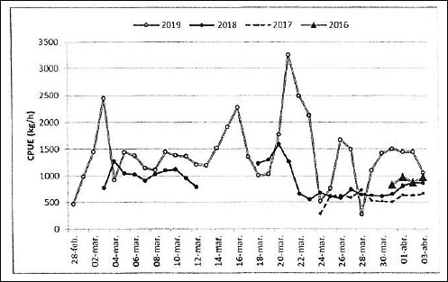 - El promedio de la Captura por Unidad de Esfuerzo (CPUE) para los días analizados fue de 1.412 kg/h. de arrastre efectivo.