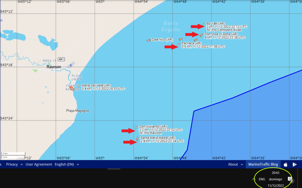 Lo verificamos, y a decir verdad se puede inferir que un buque pesquero entre 2 y 3.3 nudos estaría pescando, pero nosotros no somos parte de la tripulación, por lo que no estuvimos sobre los buques, pero tampoco somos jueces, simplemente exponemos lo que vemos, aunque llama poderosamente a la atención el silencio de las entidades de contralor, ya que en aguas de jurisdicción nacional sería lisa y llanamente un acta de infracción. El hermetismo es total entre marineros, es lógico, nadie roba con una corneta y bombo, y un cartel con su DNI.!, pero a veces los sistemas de seguimiento dejan perpetuado, datos de posición, velocidad, dirección y tipo de maniobra compatible con operaciones de pesca, y no de un solo buque, sino de gran parte de la flota, todos los días y después de las 19 hs vulnerando la normativa vigente (Resolución CFP Nro. 7/2018, SAGYP 151/2018, enmienda Resolución CFP Nro. 9/2022).