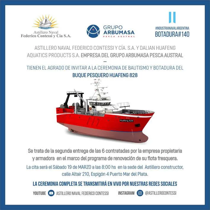En este caso es el segundo barco de los seis que tienen proyectados en el Astillero a pedido del armador “Dalian Huafeng Aquatics Products S.A.” y llevará el nombre de “Huafeng 828” en continuidad con el anterior que fue botado en el mismo lugar, hace poco más de un mes, más precisamente el 5 de febrero.