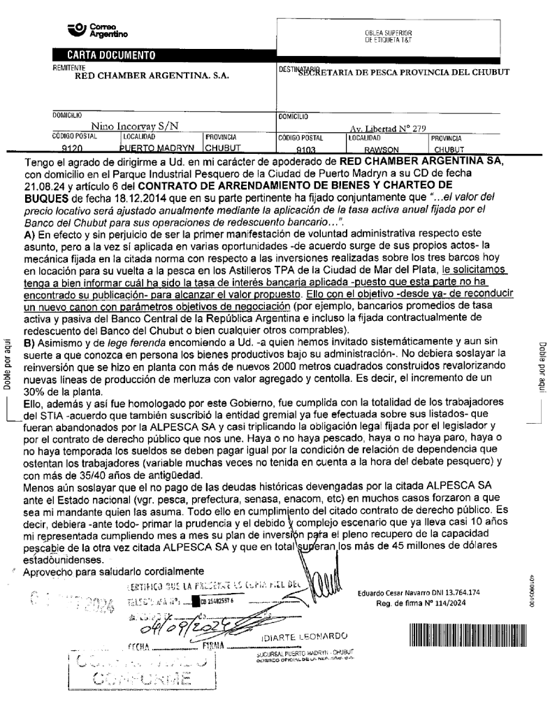 En un contexto de creciente incertidumbre, la empresa Red Chamber Argentina ha manifestado su profundo rechazo a la decisi贸n del Secretario de Pesca de Chubut, Andr茅s Arbeletche, de exigir mediante carta documento la restituci贸n de los bienes en un plazo de 120 d铆as. Seg煤n lo dispuesto, la provincia asumir谩 la responsabilidad sobre los 600 empleados permanentes de la compa帽铆a. La respuesta de la empresa no se hizo esperar, habiendo sumado en su haber en reiteradas oportunidades a lo largo del tiempo, invitando a la Secretar铆a de Pesca de Chubut, a resolver y transitar un camino por v铆a formal e informal para aclarar su situaci贸n frente al organismo.